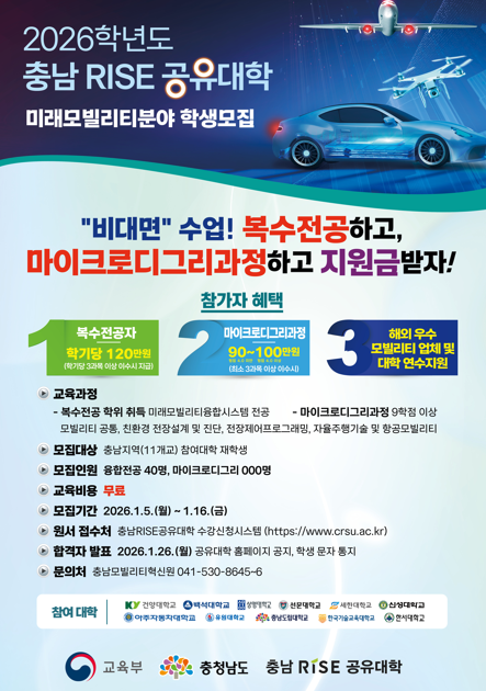 2026학년도 충남RISE 공유대학 미래모빌리티융합시스템전공 학생모집 안내 충청남도 지역혁신중심 대학지원체계(RISE) 사업의 일환으로 운영되는 충남 RISE 공유대학에서 2026학년도 미래모빌리티융합시스템전공 참여 학생을 아래와 같이 모집하오니, 관심 있는 학생들의 많은 참여 바랍니다. ▶ 전공명: 미래모빌리티융합시스템전공