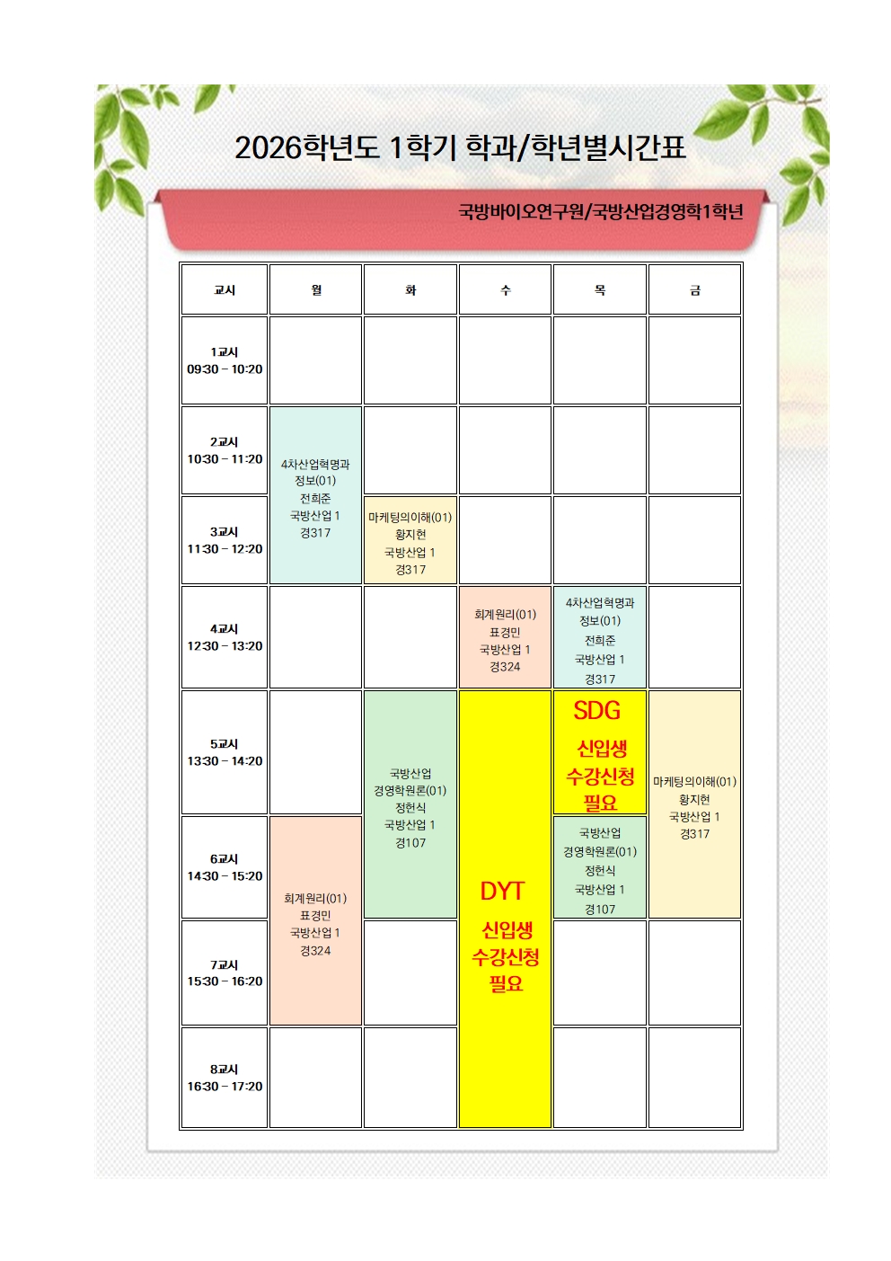 안녕하세요. 국방산업경영학부 입니다^^ 2026학년도 신입생 수강신청 및 시간표를 아래와 같이 안내드리오니 첨부파일에 있는 수강신청 안내문과 매뉴얼을 꼭 읽어보시고 시행해주시기 바랍니다.