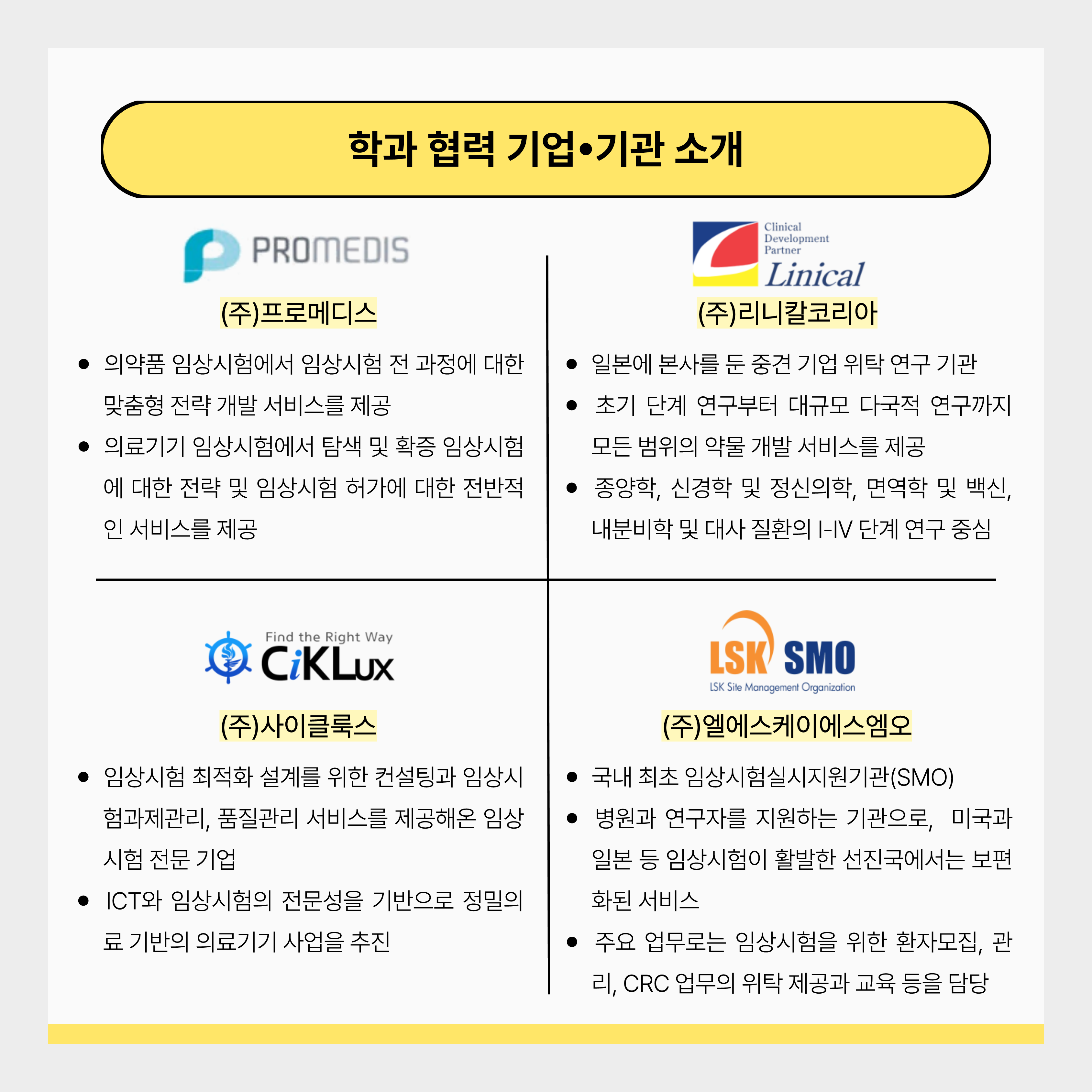 『 임상의약바이오학과 협력 기업ㆍ기관 소개 』글의 상세내용을 확인하는 표로 제목, 부서명, 등록일, 조회, 첨부, 내용으로 나뉘어 설명합니다.