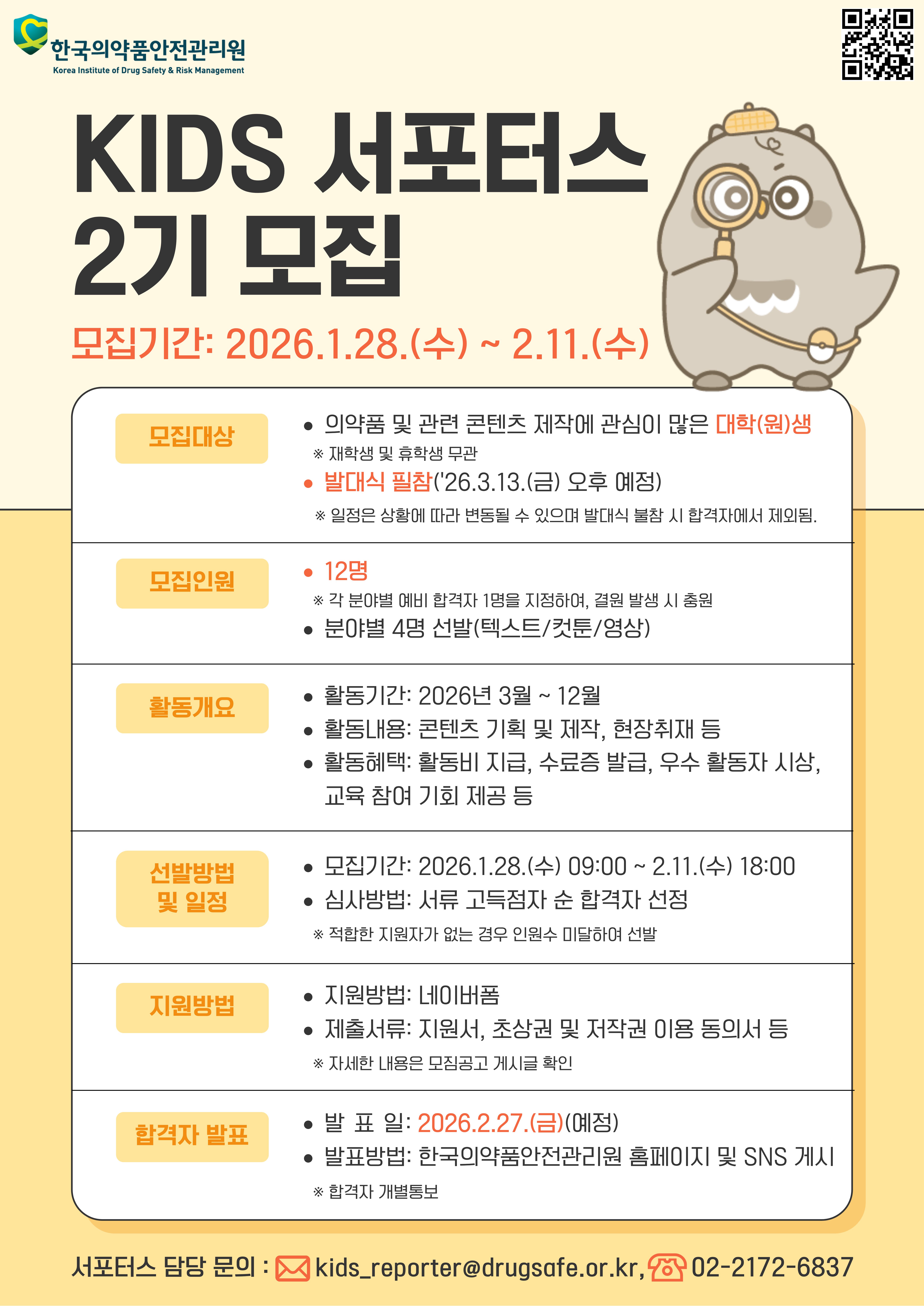 [한국의약품안전관리원 KIDS 서포터스 2기 모집(~2.11.수)]