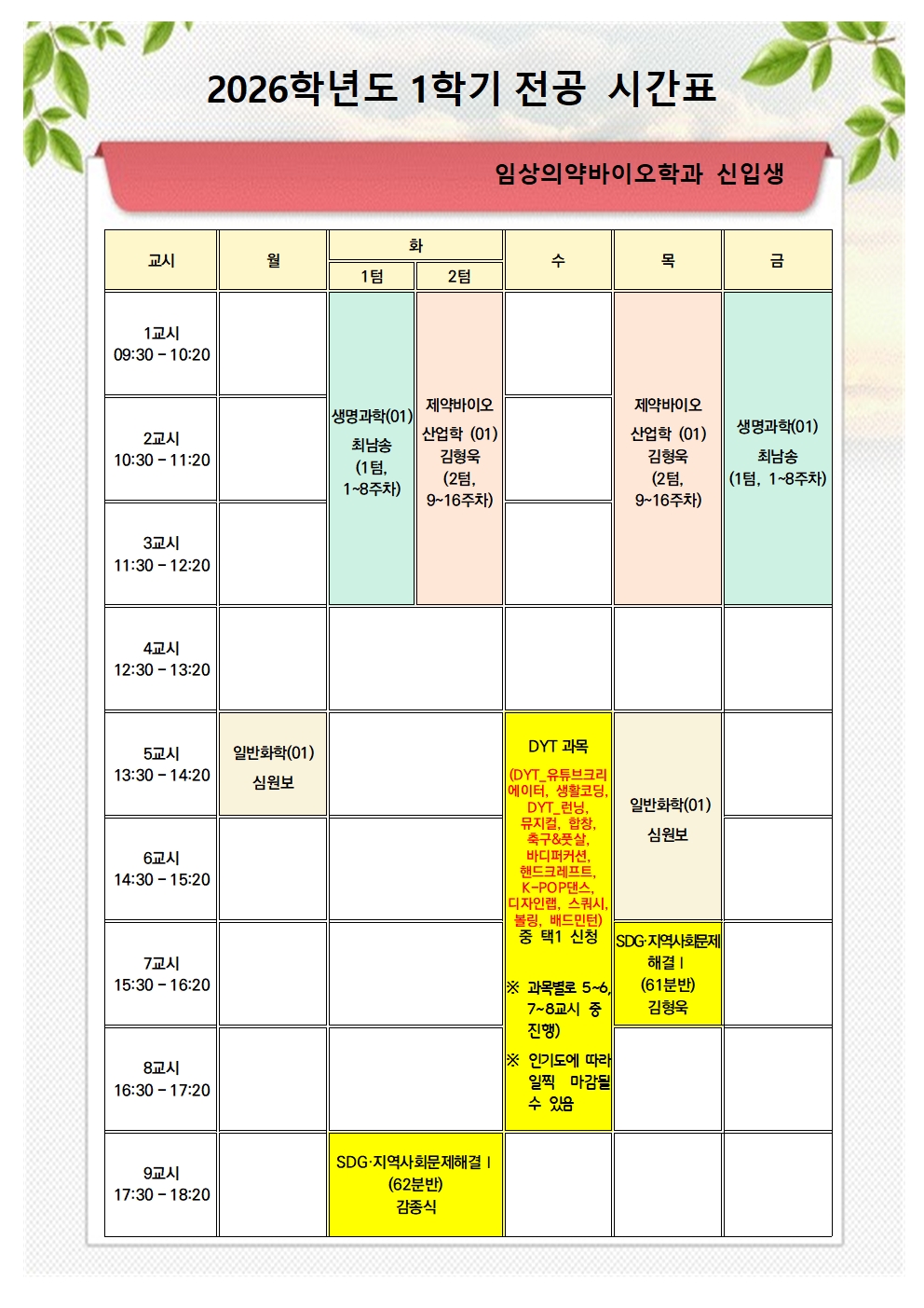 - 임상의약바이오학과 2026-1학기 전공 시간표 FAQ> 1) 1텀은 1~8주 수업, 2텀은 9~16주차 매주 2회 수업으로 한학기 수업 마무리 2) 교양필수(노란색 음영) DYT, SDG과목은 꼭 수강 신청 해야 함 - DYT: 개설 과목 중 본인 시간에 맞는 과목 택1 신청_배드민턴 등 인기과목은 빠르게 마감될 수 있음.) - SDG: 개설 2개 과목 중 본인 시간에 맞는 과목 택1 신청_화 9교시(감종식 교수님) / 목 7교시(김형욱 교수님) 3) 기타 비어있는 시간 대 교양 선택과목 수강신청: 최대 2과목 - 월: 1~4 / 6~8교시 개설 과목 - 화: 5~8교시 개설과목 - 수: 1~4교시 개설 과목 - 목: 선택적으로 7~8교시 가능(SDG 화 9교시 신청한 경우에만) 4) 수강신청 가능학점은 최대 19학점으로, 수강신청 후 잔여 학점에 대하여 개강 후 1주일간 추가 수강신청 진행 ※ 시험(중간, 기말고사) 고려하여 시간표 잘 편성해 보기 바랍니다. |